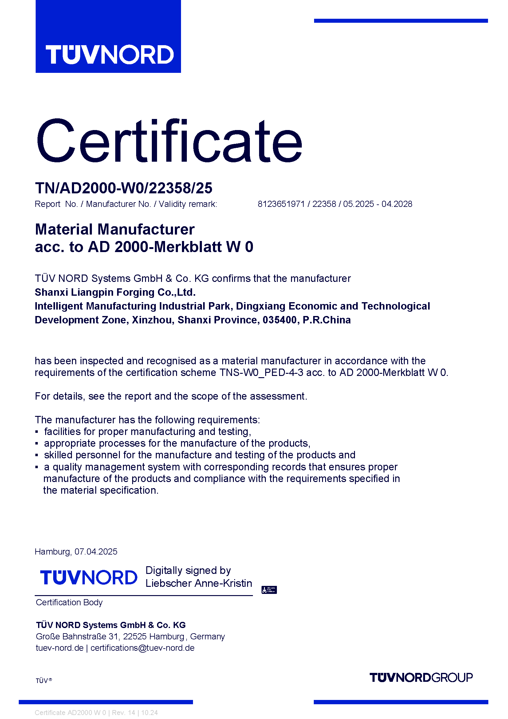 AD2000-W0 Certificate